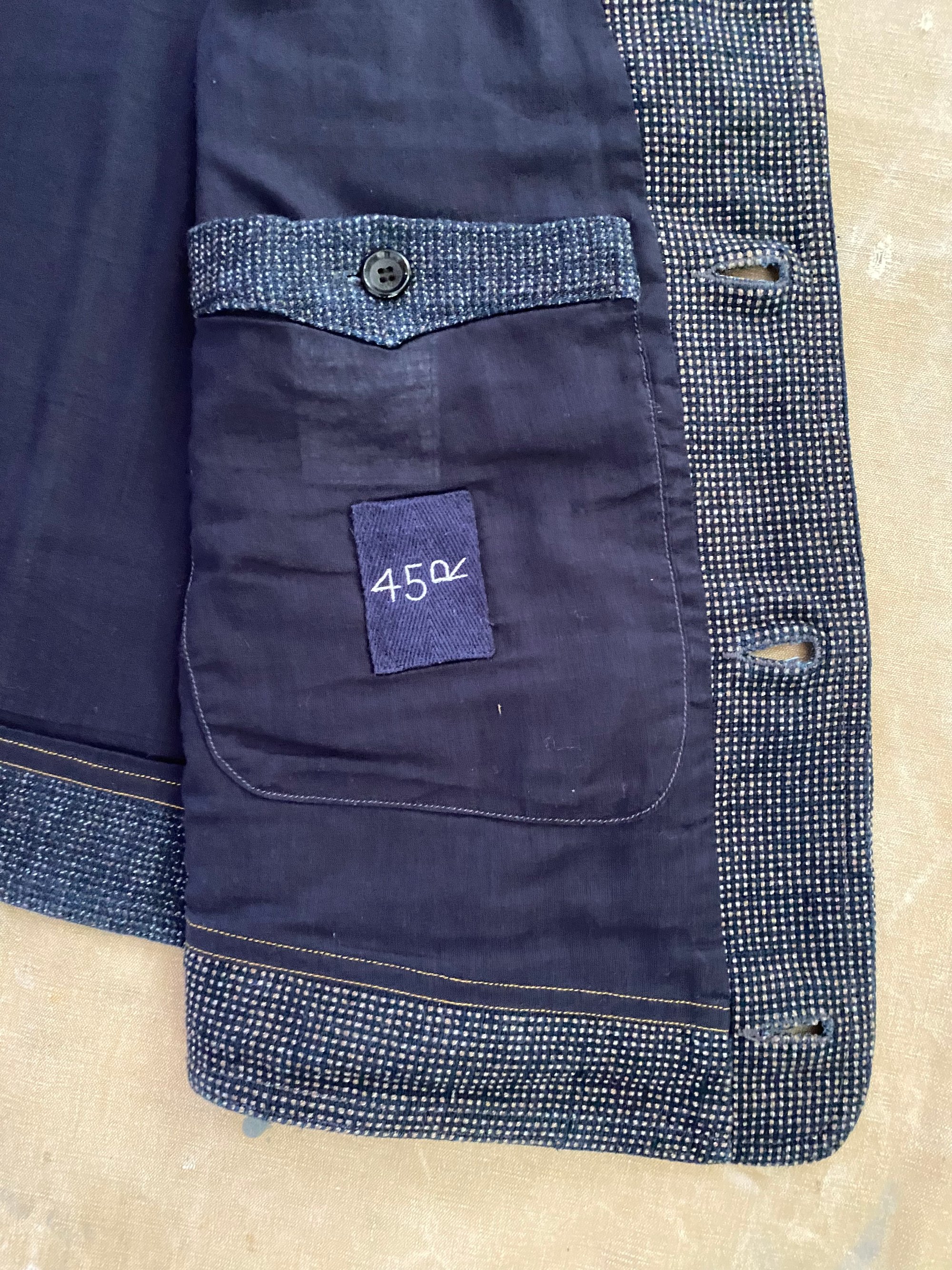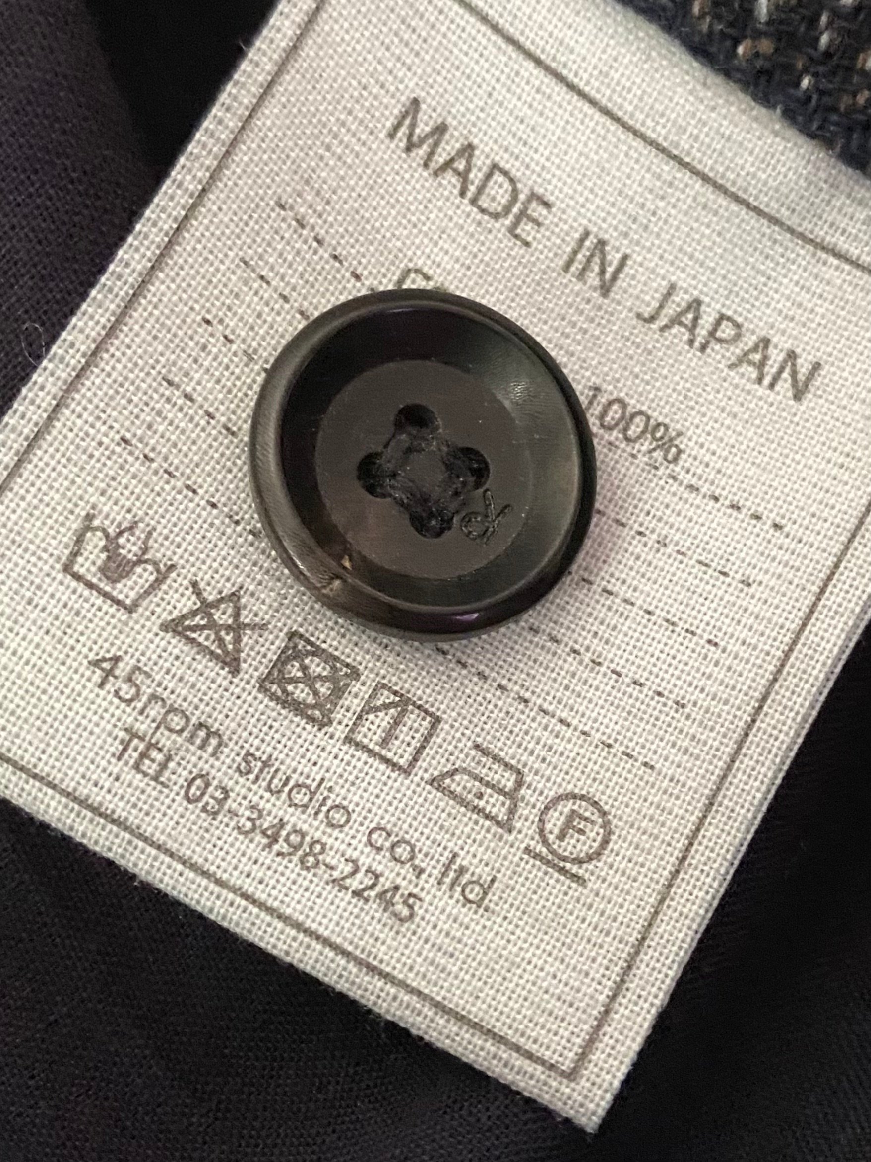 45R is well known for the incredible quality of their fabric, which are always exclusively made by 45R for their own products only. In this case this slightly uneven and slubby fabric has been named "Cotton Tweed". The fabric is made with a mix different colours treads and Ai indigo dyed treads - in a way that resemble the 剣道着 (kendo-gi) textile fabrication.