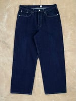 DESCRIPTION The Wide Pant is produced in Japan from a 14oz Kurabo Recycle Red Selvage Denim Fabric, made of 100% cotton. Featuring a wide fit, mid-rise, and a classic five-pocket design with a button fly, it offers a relaxed, structured silhouette. The Blue Rinsed wash gives it a clean, raw look that will develop character over time.