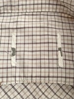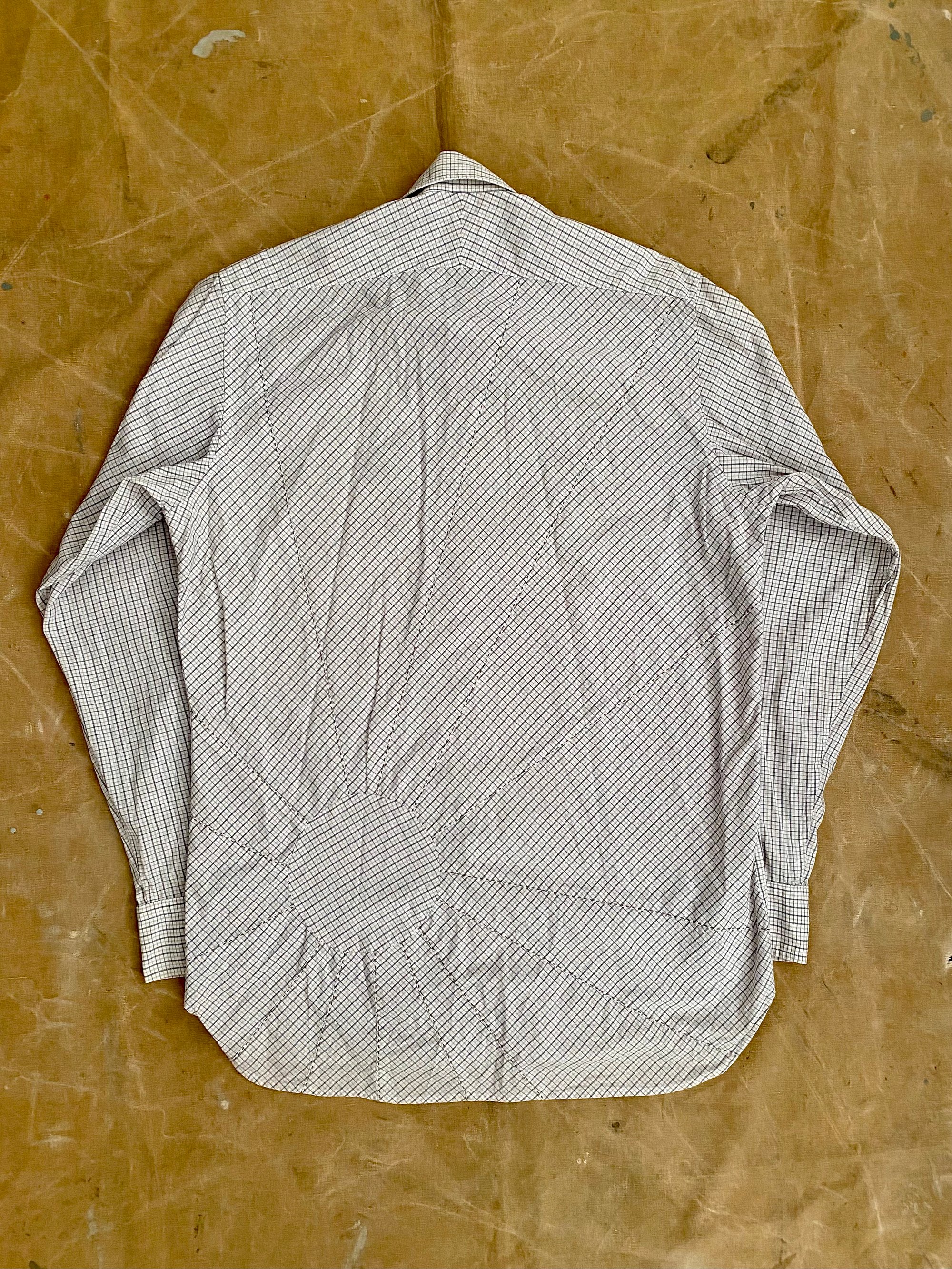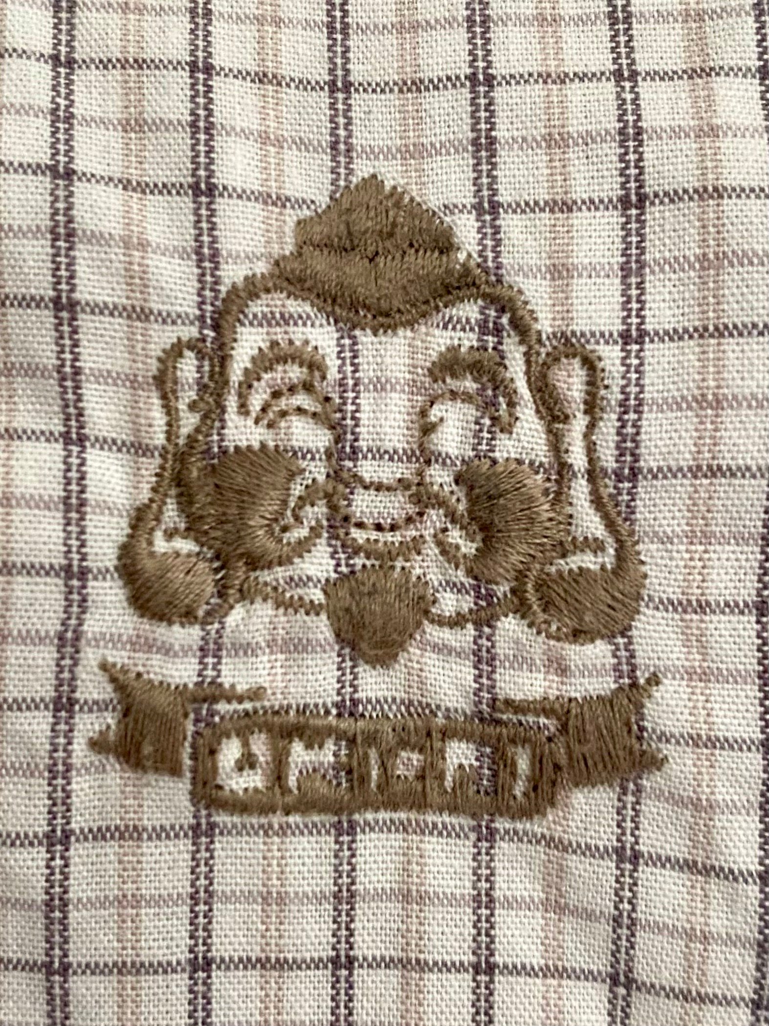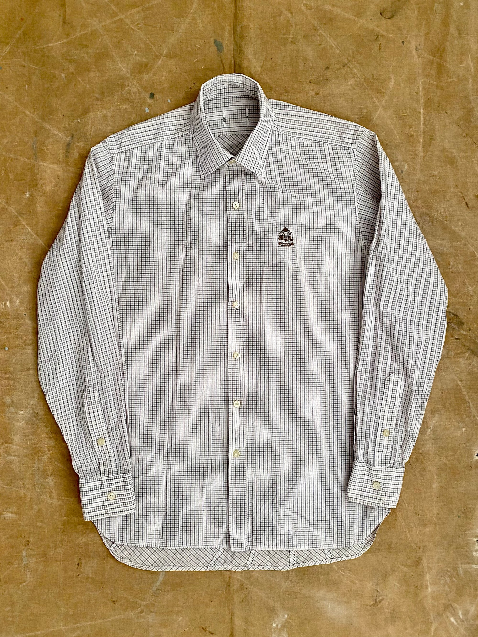 Crazy Oki-ni x Evisu collab shirt, featuring a distinctive micro-check pattern. It is characterized by the unique embroidered logo on the chest and a cool rising sun stitching work on the back.