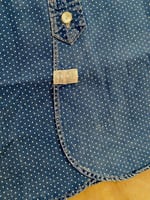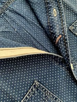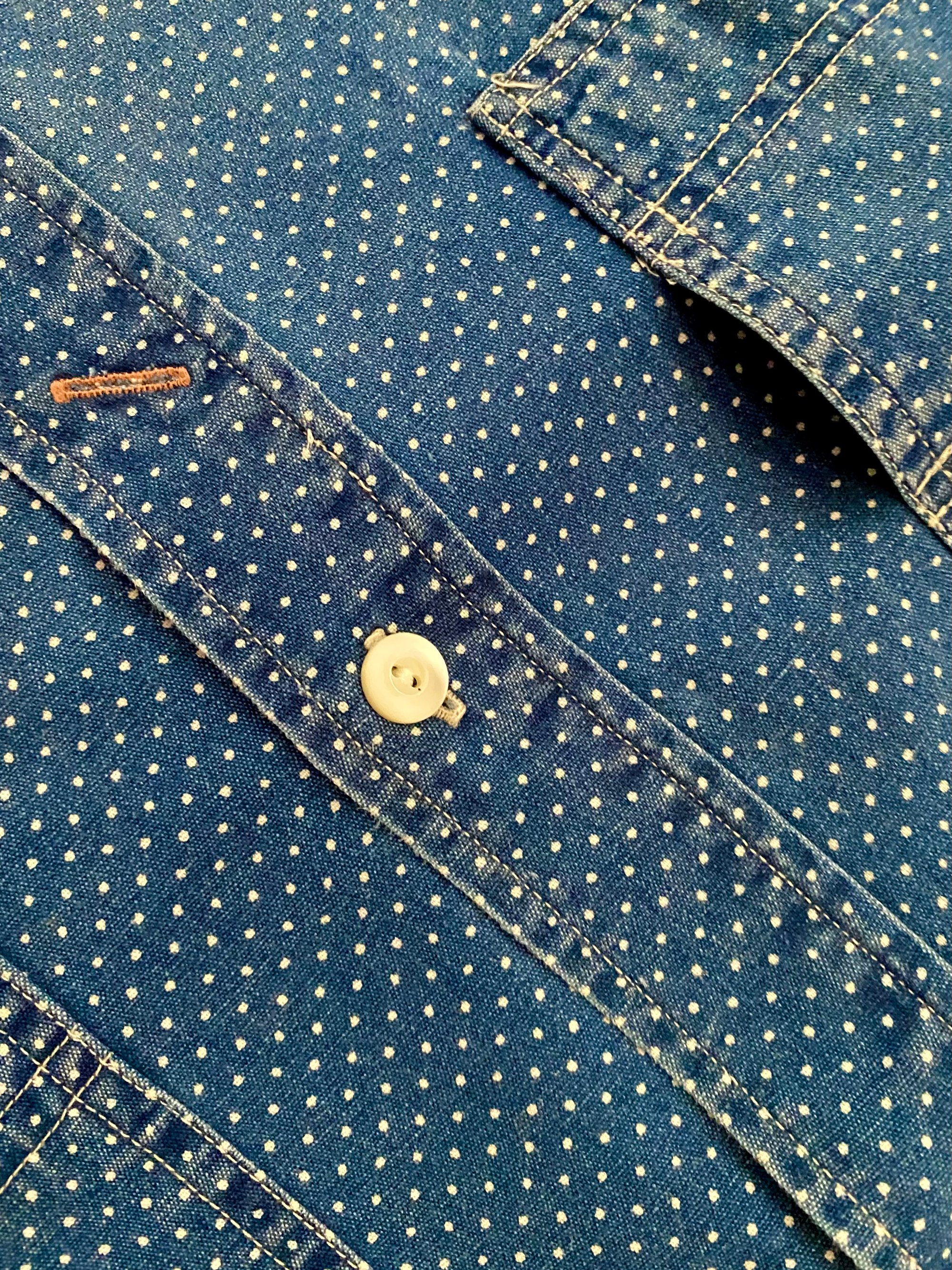 Made with indigo-dyed cotton cloth from Japan. Discharge-printed with a dot motif that is inspired by a vintage textile. Authentic runoff chain-stitched construction on the side seams. Asymmetrical chest pockets modelled after work-shirts from the 1920s. Tinted for a vintage feel.