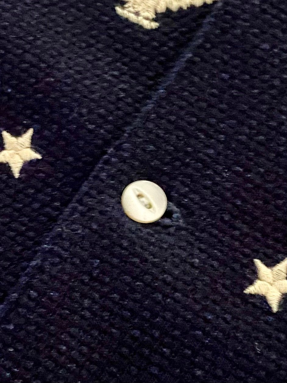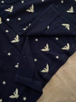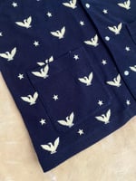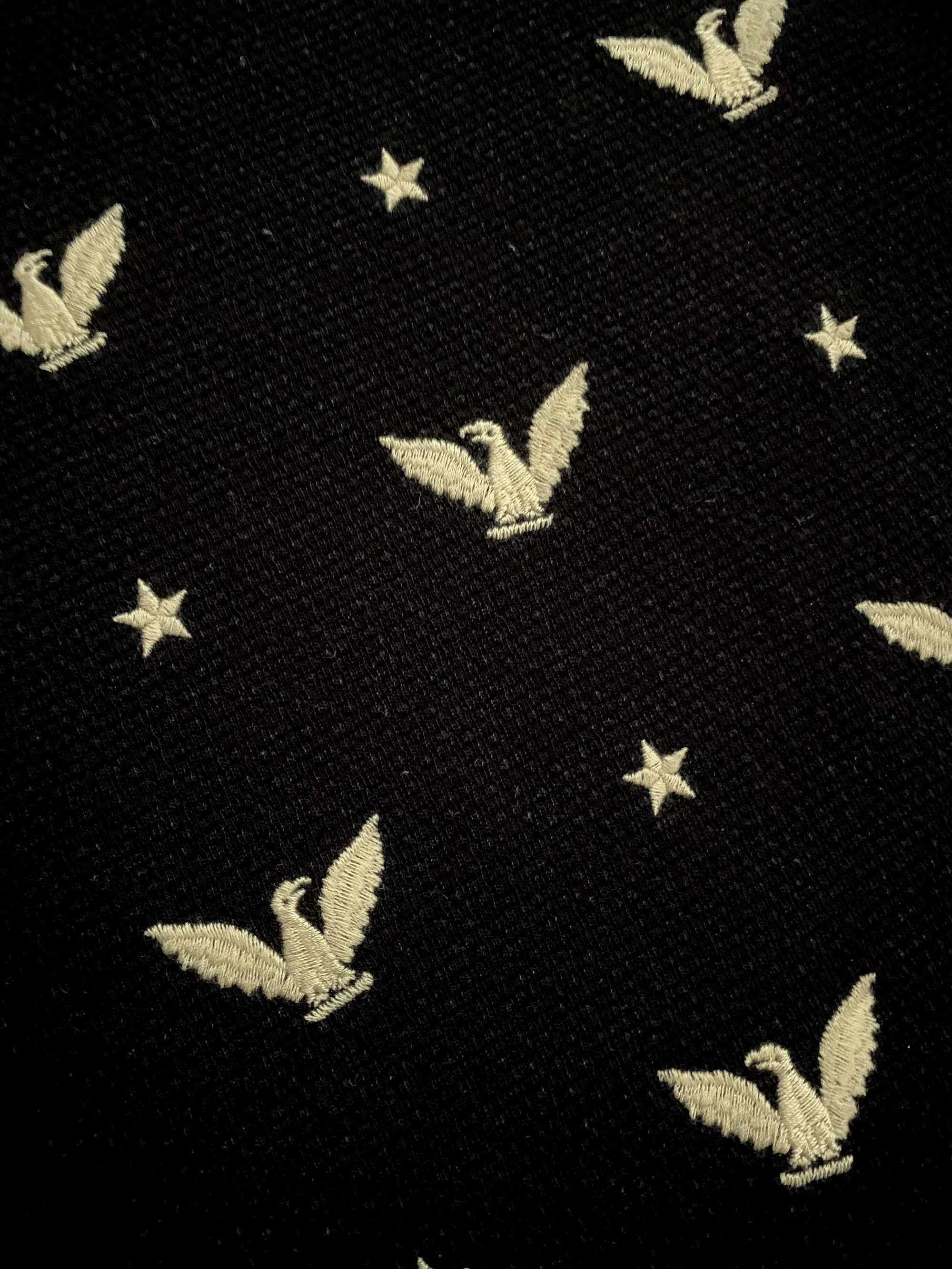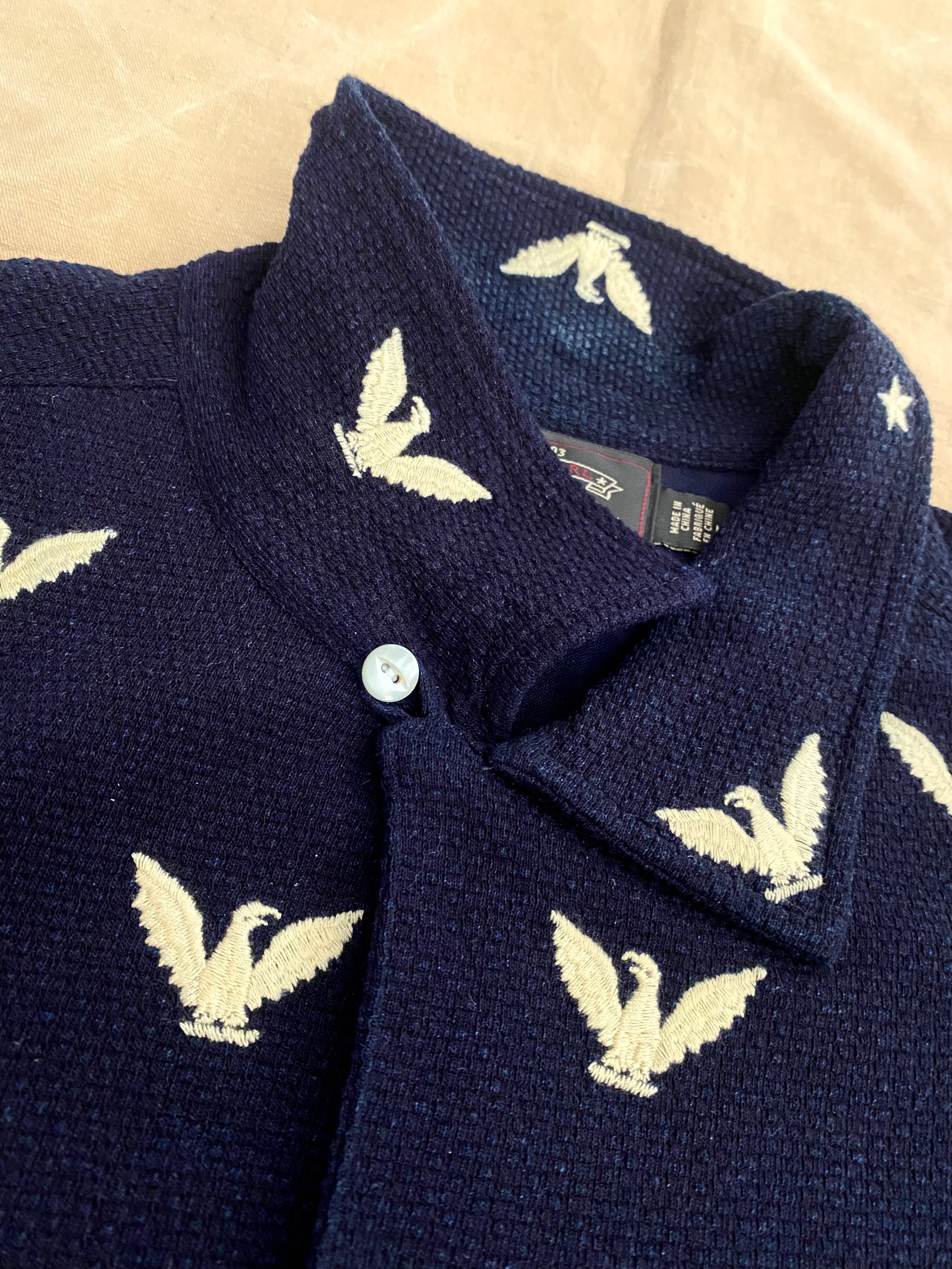 Crafted from indigo-dyed cotton mesh and features an all-over eagle-and-star embroidery pattern. The design is inspired by a vintage silk scarf from the 1940s.