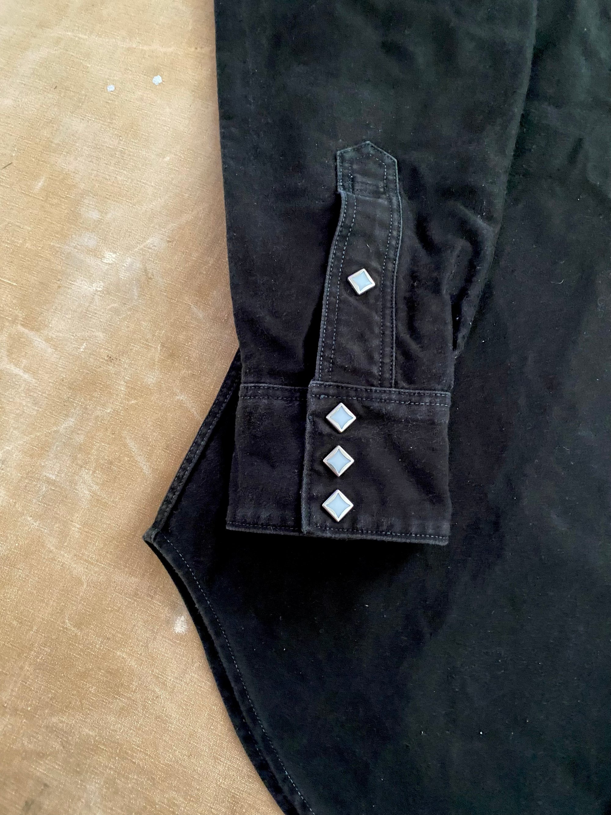 Commonly known as the "Sawtooth Western Shirt", referring to its sharp double pointed flap pockets, this Moleskin western shirt is a reproduction of a 1960s archive piece.
