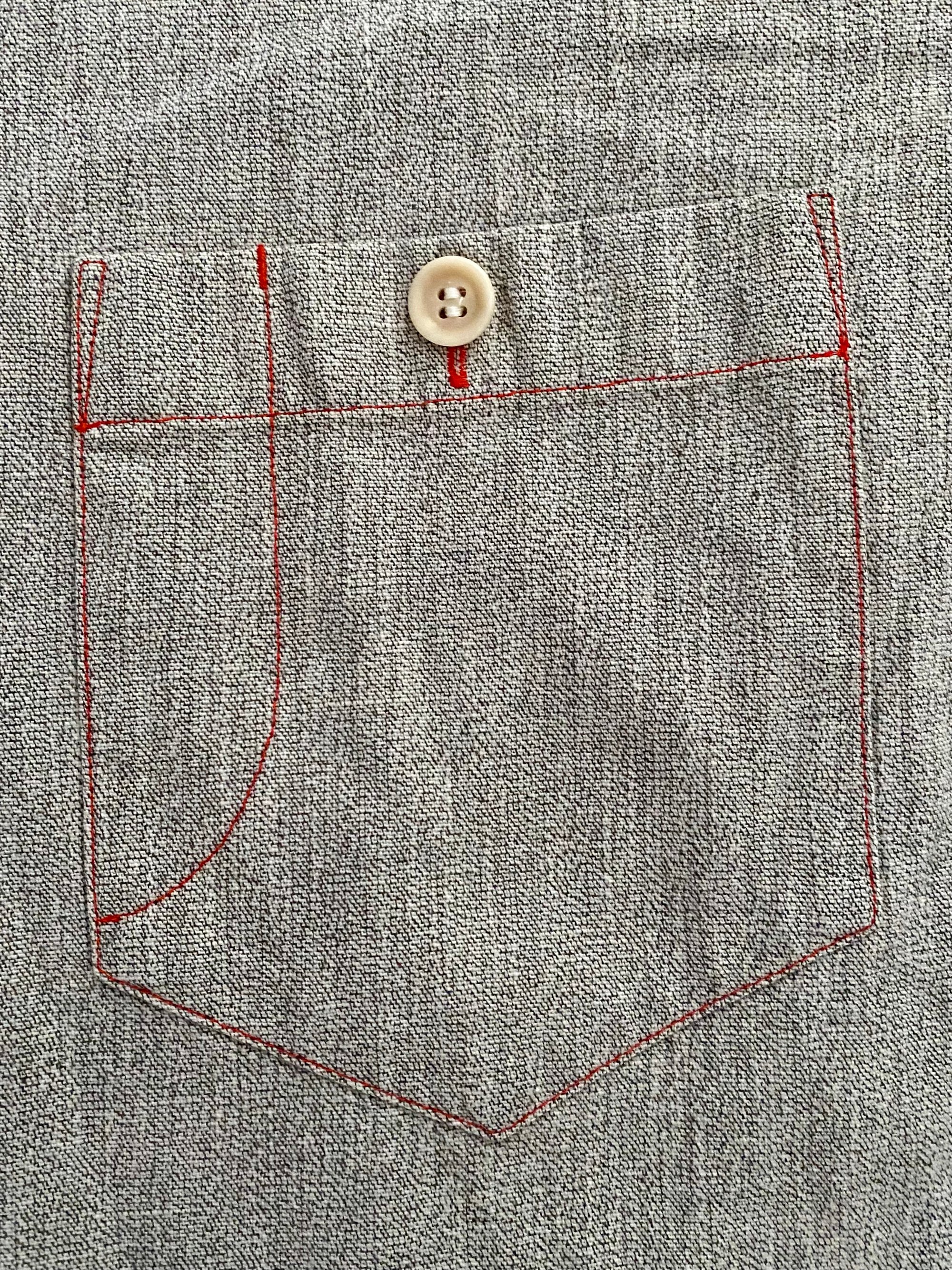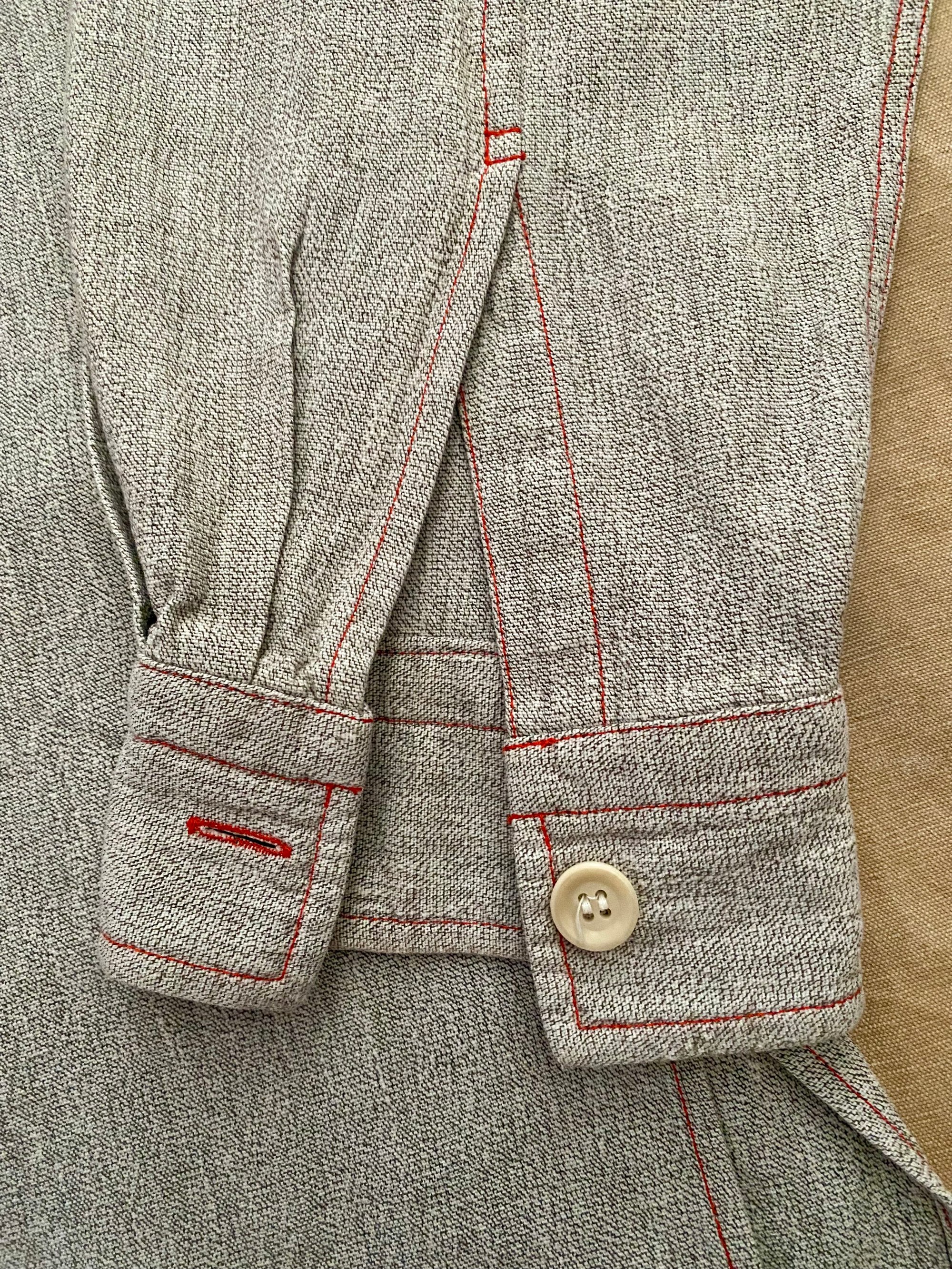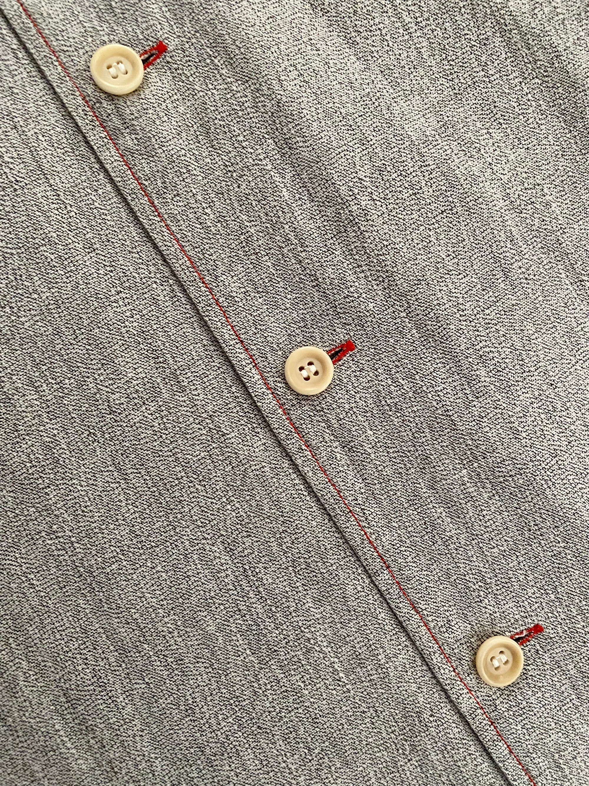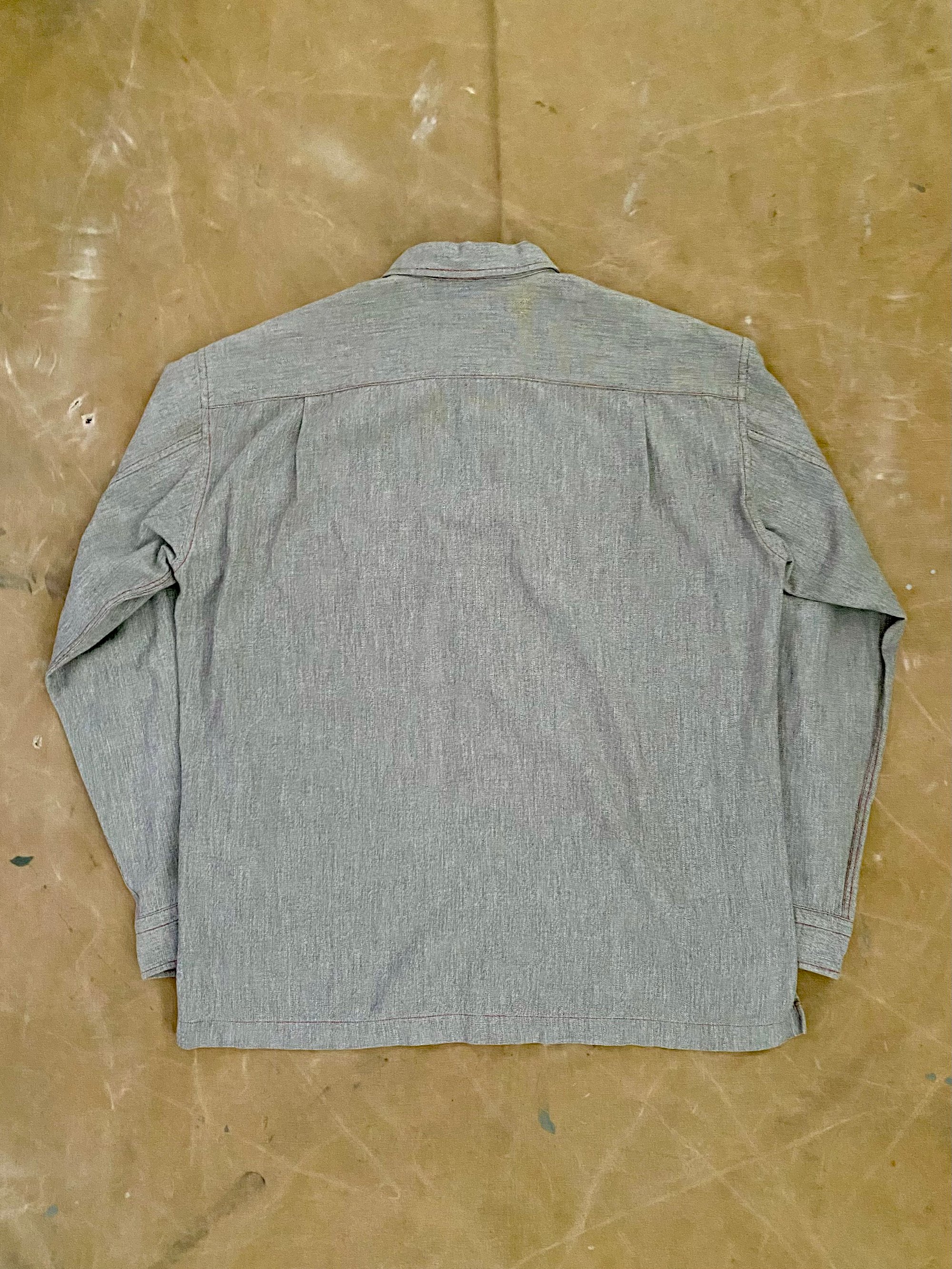 Vintage Issey Miyake long-sleeved grey work shirt, made of a salt and pepper light denim (thick chambray?) fabric.