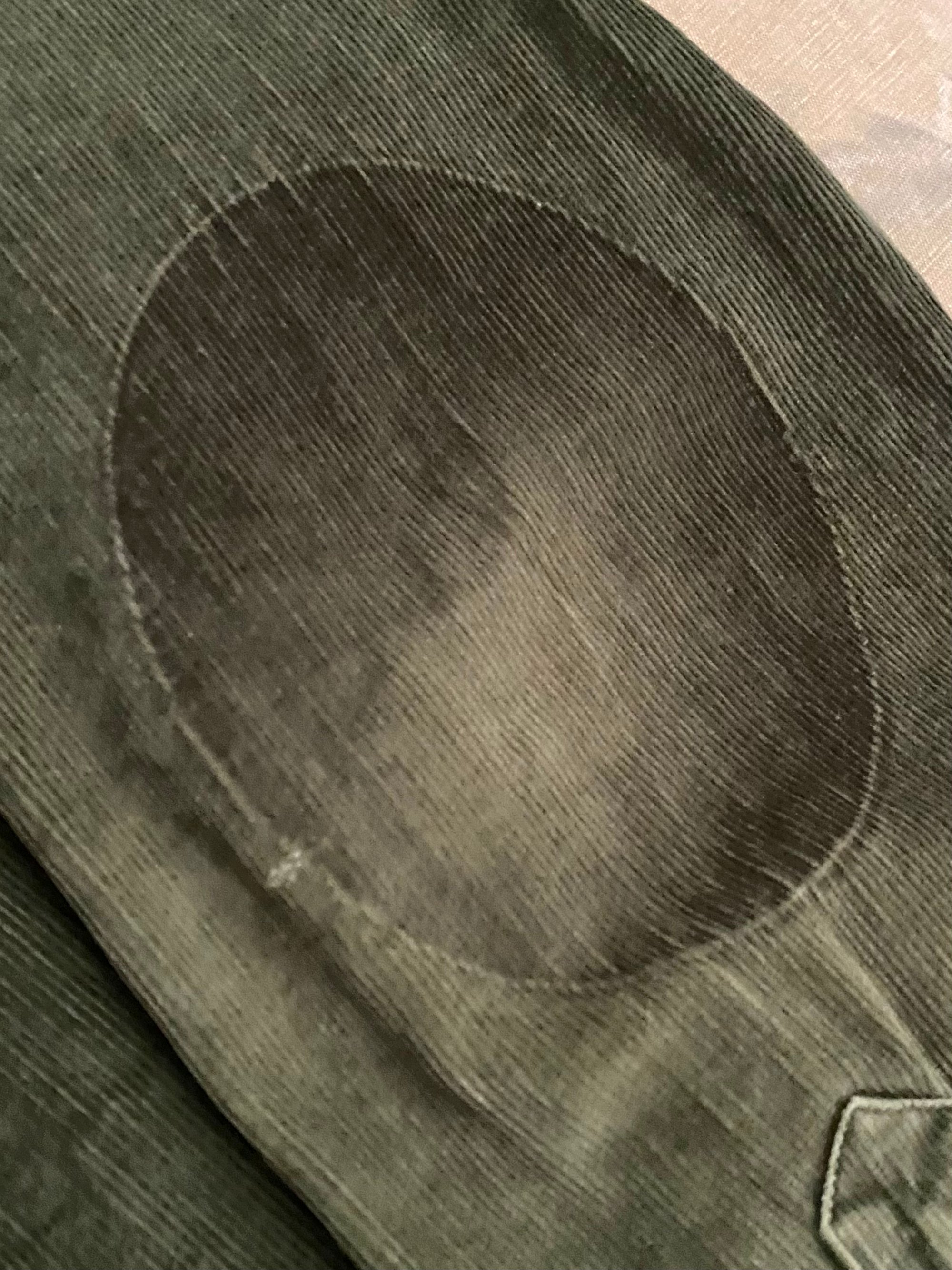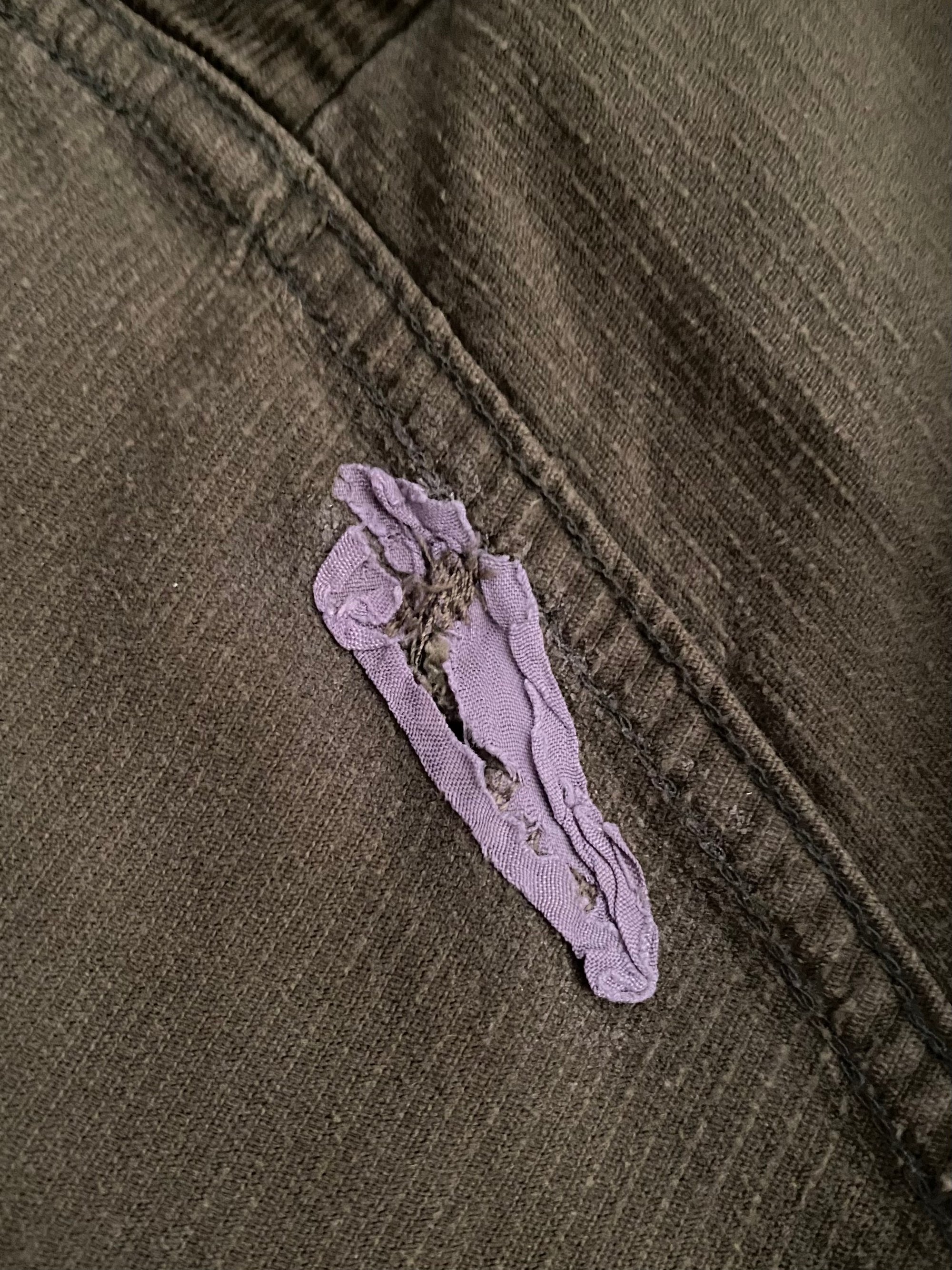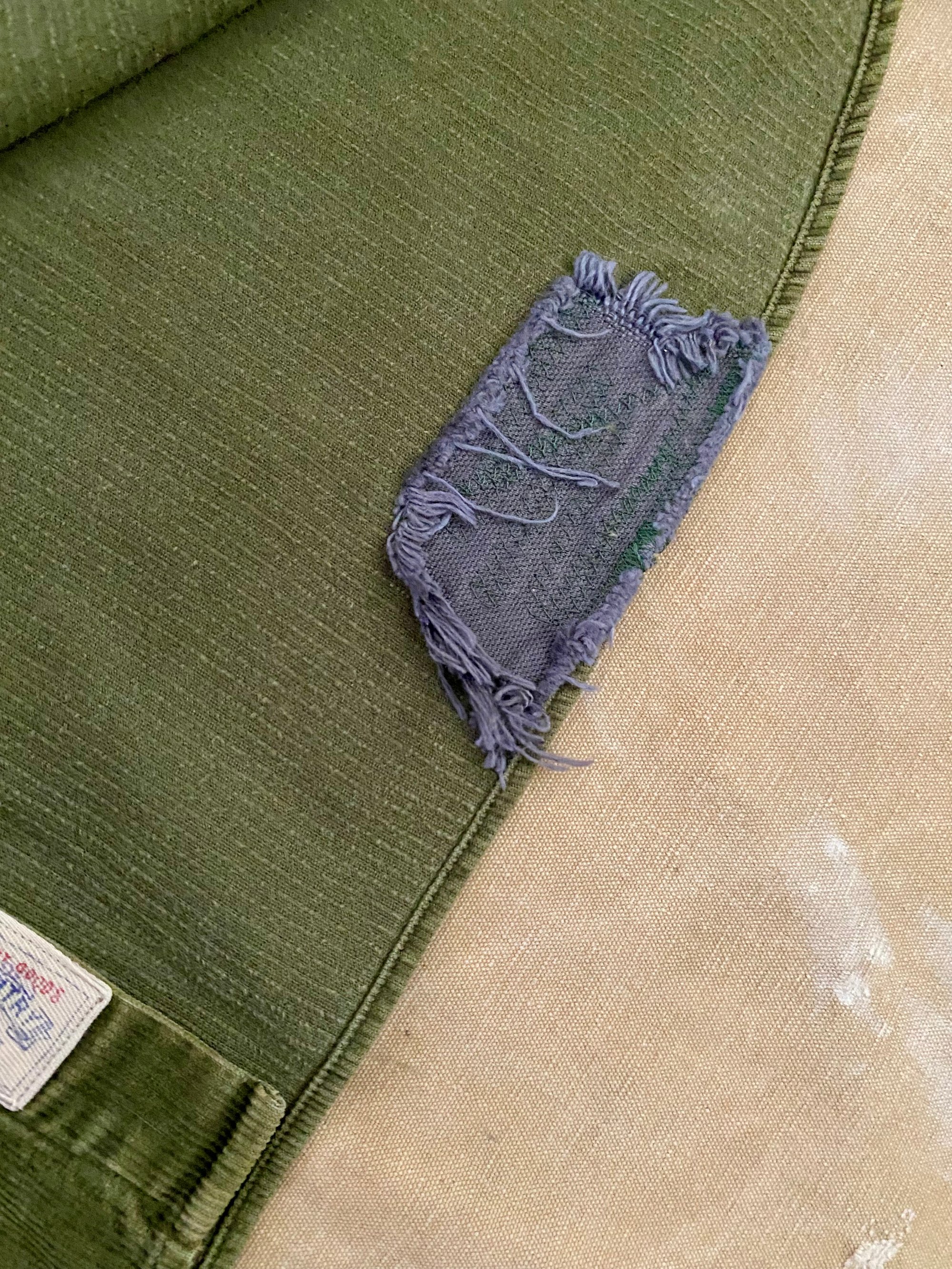 CONDITION Major signs of wear and fade. One of the inside labels has been cut off. Very cool repairs on the back left hem and on the right shoulder (please see pictures).
